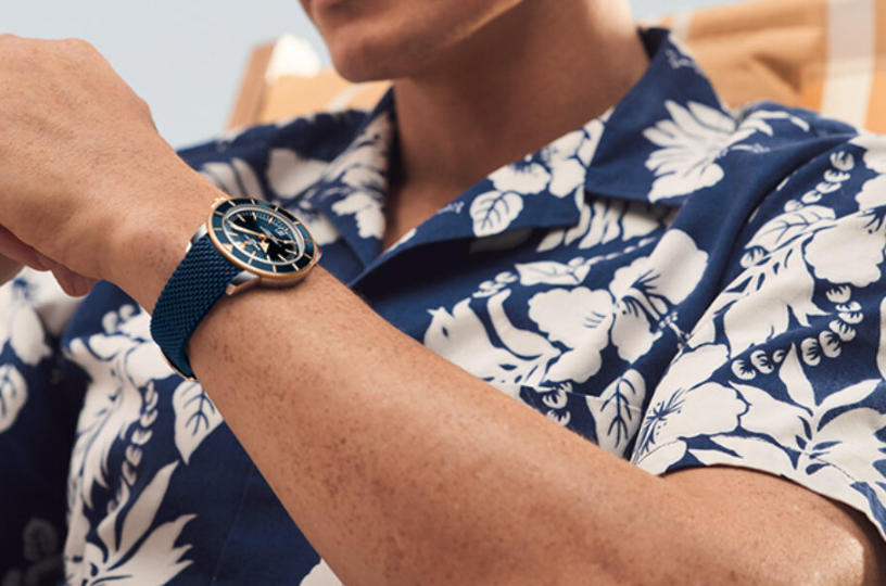 Along with the slew of new variants, the high quality reproduction Breitling Superocean Heritage watches also comes in a limited-edition collab with surfing icon Kelly Slater. Limited to just 500 pieces, it takes the 40mm model in navy blue and adds a tropical foliage pattern on the dial that looks way more subtle than it sounds.