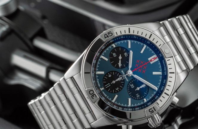 Breitling brings out the big guns with the Chronomat 42 B01 Red Arrows Limited Edition. As the name suggests, this version incorporates the RAF Red Arrows’ insignia. Not only that, but the famous flying “diamond nine” formation of the Red Arrows jets is displayed prominently on the dial, in place of the “B” logo.
